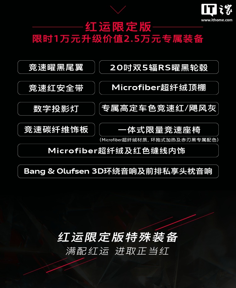 车辆还配备动感曜黑运动尾翼、数字投影灯、20 英寸 RS 风格轮毂,并拥有一体式限量竞速座椅与 Bang & Olufsen 3D 环绕音响系统,共同构成限定专属套装。
